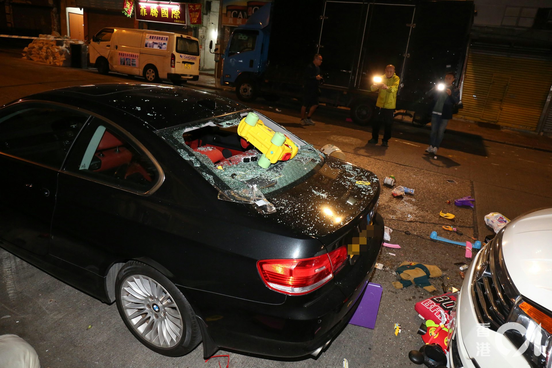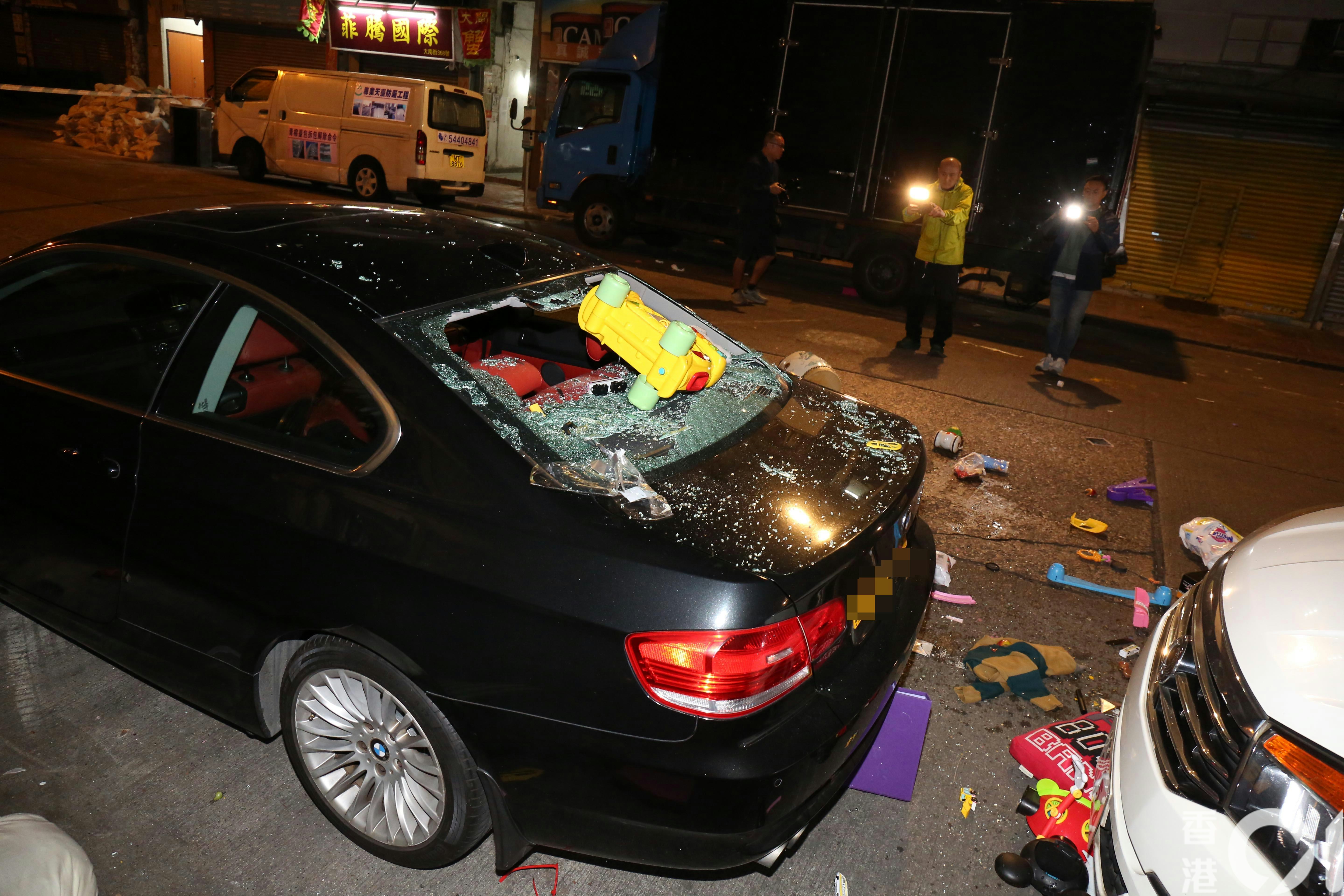 深水埗凌晨發生高空墮物事件,一輛停泊在街邊的私家車被砸毀。警方於今日(11日)凌晨約12時接報,指大南街343至345號一個單位有大量物品從高處拋下,擊中樓下車輛。警員到場後展開調查,初步懷疑是一名兒童從屋內把玩具及其他雜物拋出窗外。救護人員亦曾到場戒備,事件中無人受傷。 據現場消息指出,涉事單位位於5樓,屬於「一劏三」的劏房。當時一名4歲、烏干達籍男童被獨自留在屋內,不斷將玩具及各種物件掟落街;其29歲母親則帶同約1歲的弟弟離開住所。警方其後將男童、其母親及弟弟一併帶返警署調查。該名母親涉嫌「對所看管兒童或少年人虐待或忽略」被捕,目前正被扣留調查,案件由深水埗警區刑事調查隊跟進。據了解,被捕女子持「行街紙」留港。 警方帶走3母子,當中母親涉嫌「疏忽照顧兒童」被捕。 警方其後將該名母親及兩名兒子一同帶返警署調查,其中母親涉嫌「疏忽照顧兒童」被捕。 網上流傳的圖片及影片顯示,有人從窗邊拋下一架疑似黃色玩具車,擊穿樓下私家車的尾窗玻璃。現場路面散落大量物品,包括玩具、家居用品及日常雜物,如枕頭、尿片、提子及即食麵等。有目擊者形容被砸中的車輛「真係好慘」。 大批雜物從單位窗邊墮下,擊穿樓下私家車車尾車窗,仍然懸掛一個黃色玩具車,馬路散落大量玩具和家居用品,例如枕頭和尿片。(陳永武攝) 大量雜物從單位窗邊被拋下,擊破樓下私家車的車尾玻璃,一輛黃色玩具車更卡在破裂的車窗上。路面亦散落不少物品,包括各類玩具及家居用品,如枕頭、尿片等。 大批雜物從單位窗邊墮下,擊穿樓下私家車車尾車窗,仍然懸掛一個黃色玩具車,馬路散落大量玩具和家居用品,例如枕頭和尿片。(陳永武攝) 大量雜物從單位窗邊被拋下,擊破樓下私家車的車尾玻璃,一輛黃色玩具車更卡在破裂的車窗上。路面亦散落不少物品,包括各類玩具及家居用品,如枕頭、尿片等。 大量雜物從單位窗邊被拋下,擊破樓下私家車的車尾玻璃,一輛黃色玩具車更卡在破裂的車窗上。路面亦散落不少物品,包括各類玩具及家居用品,如枕頭、尿片等。
