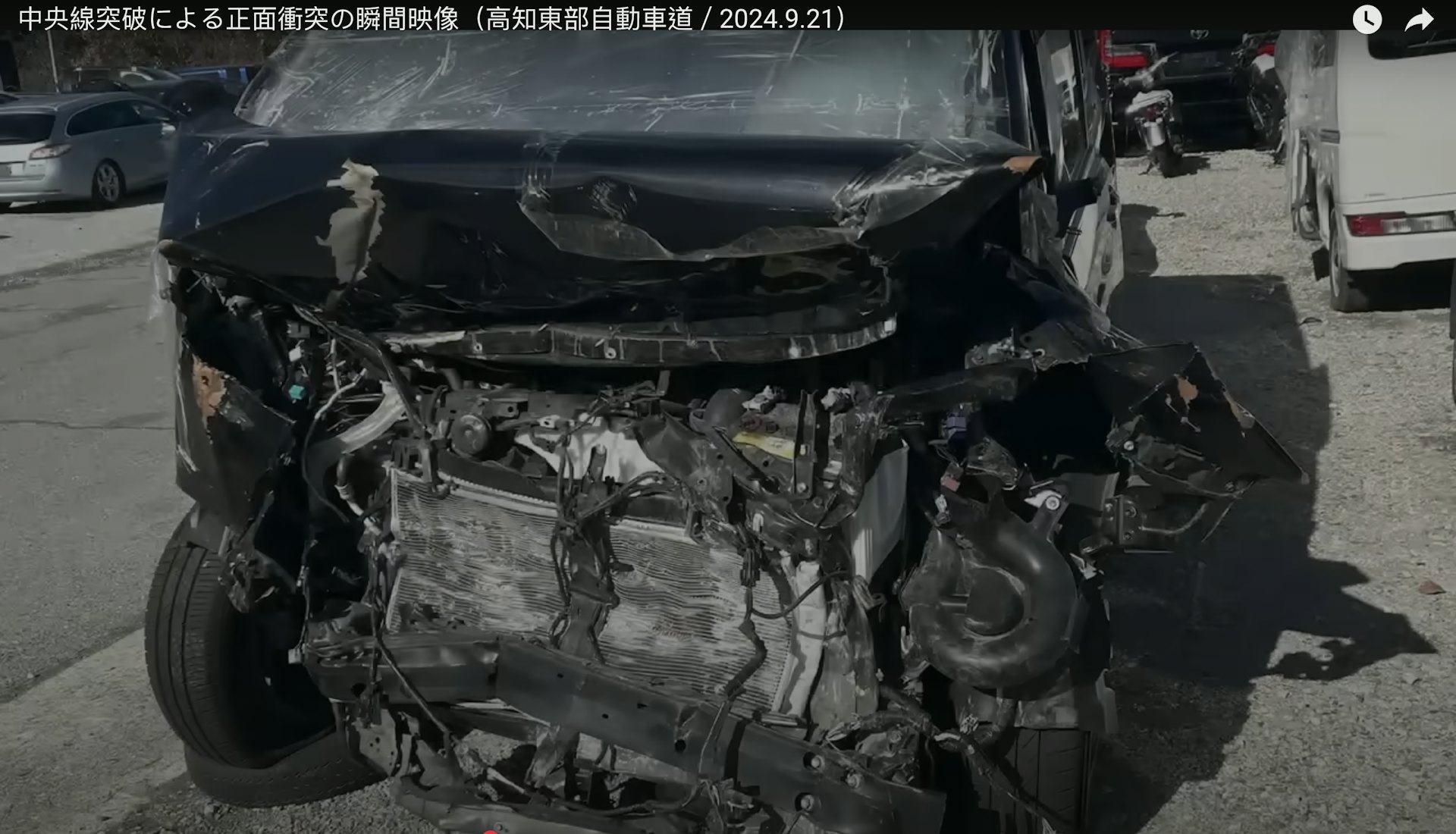 綜合日本媒體報道,日本9月發生一宗駭人車禍。一名男子在公路上開啟自動駕駛模式後,居然鬆開軚盤在車內換衫換鞋,車輛其後突然失控,越線撞向一架迎面而來的私家車,導致對方車上一名1歲男嬰傷重不治。圖為被撞車輛事後損毀嚴重。(Youtube@yanagiharamika)