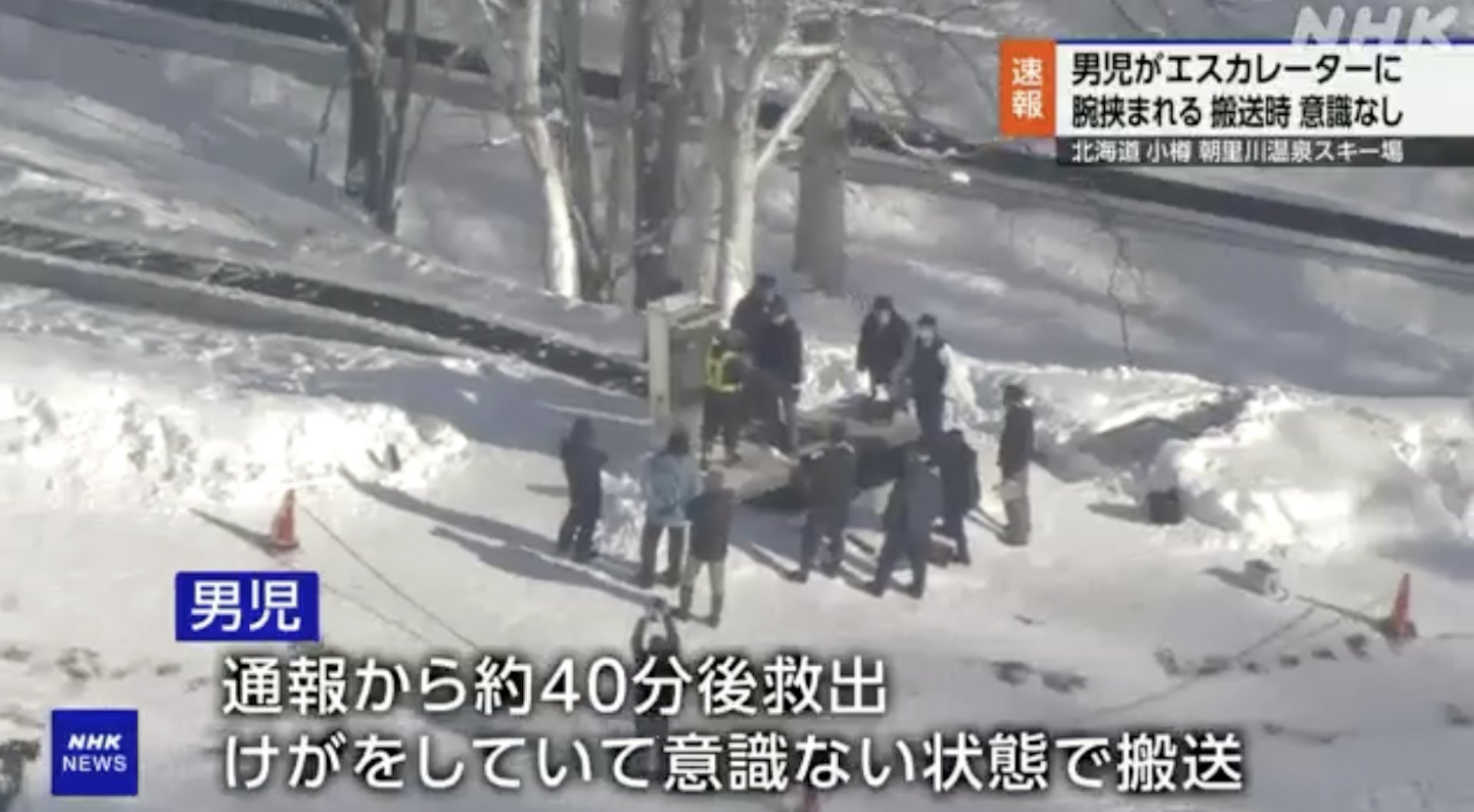 一名5歲男童2025年12月28日在日本北海道小樽朝里川溫泉滑雪場遭戶外電動輸送梯夾到手臂,被救出時已陷入昏迷,送院時傷重不治。(NHK截圖)